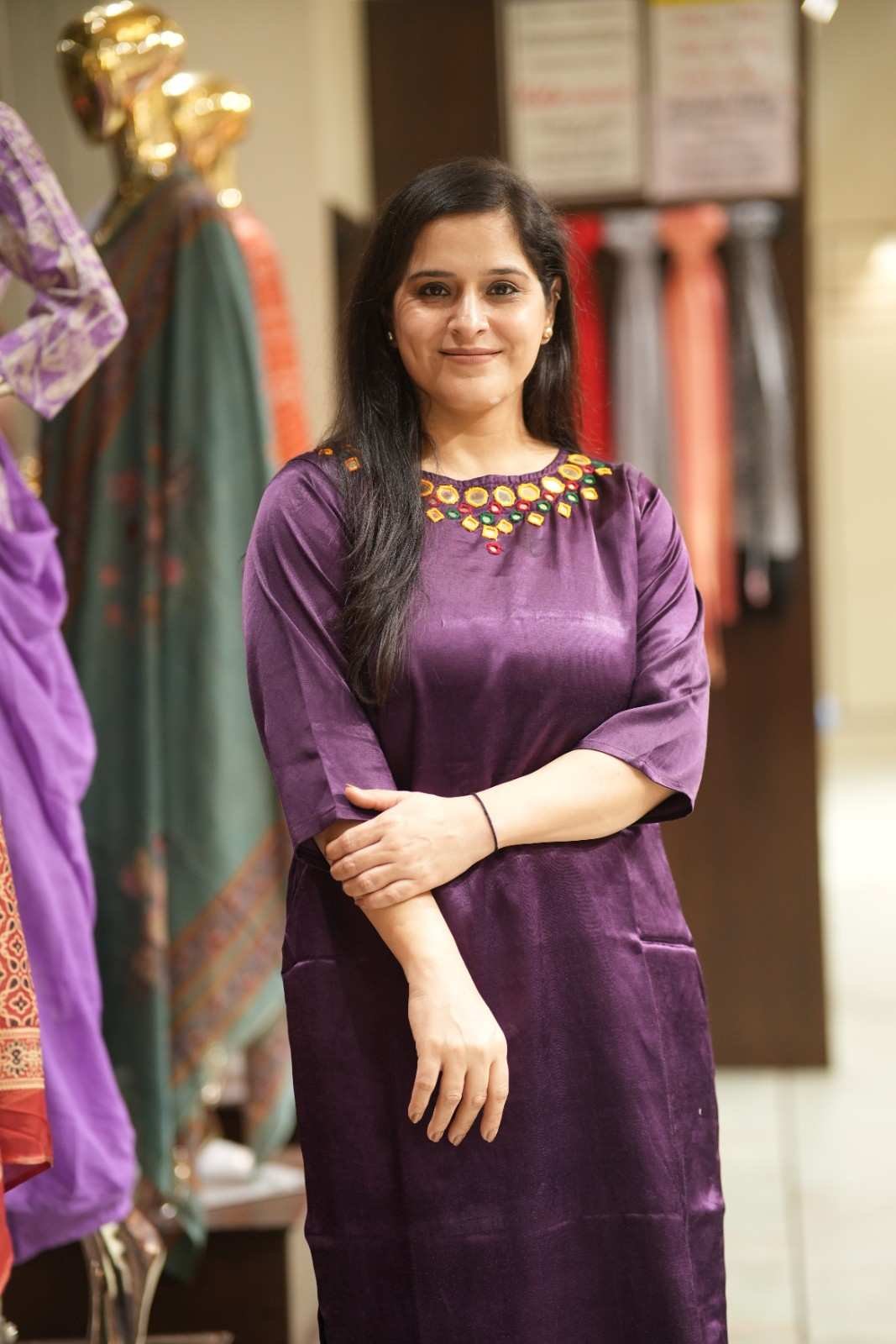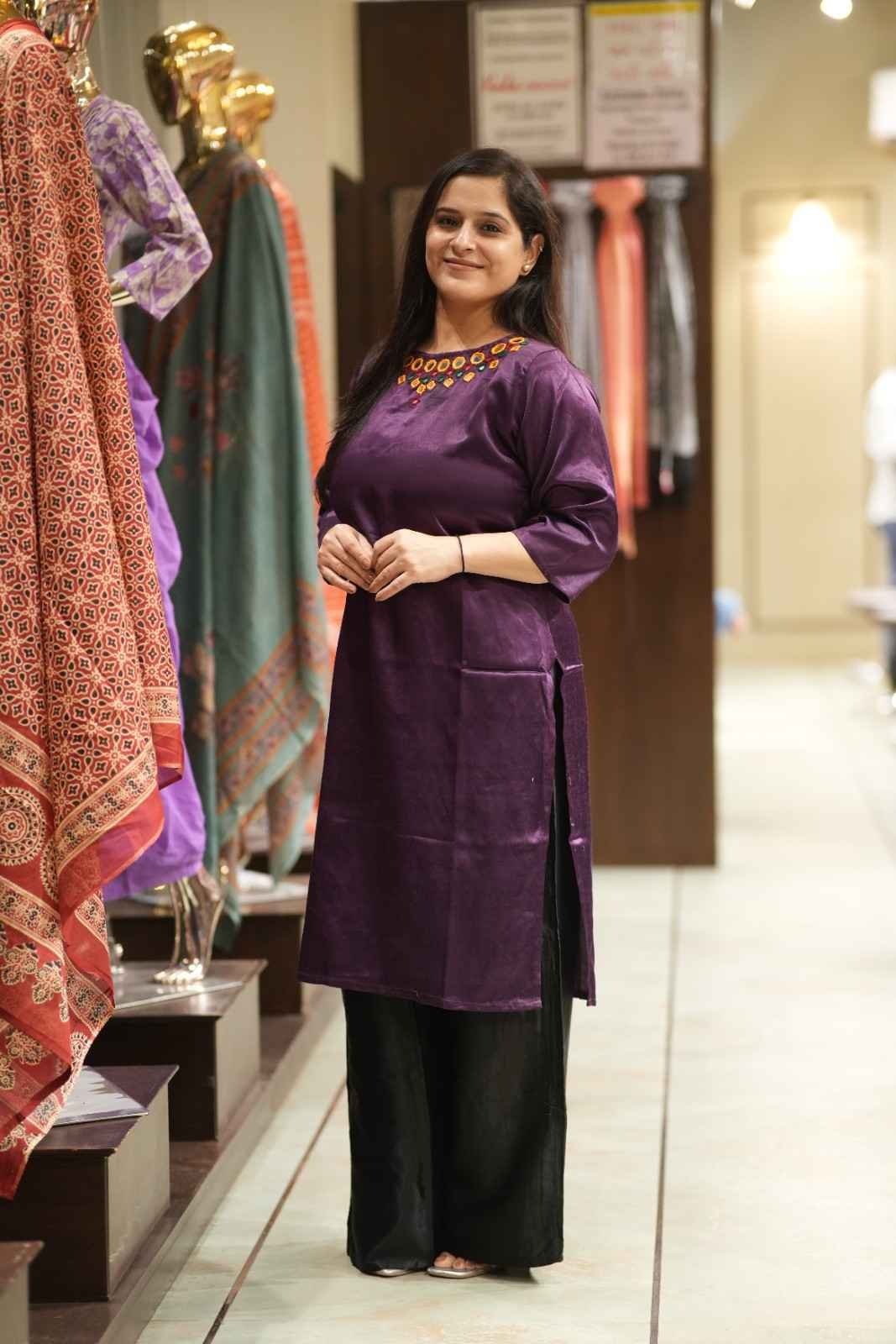 Kala Creation Neckline Beautiful Mirror Work Plain Long Kurti Purple